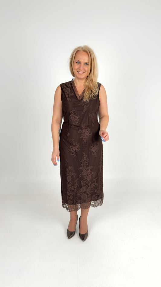 Elegants komplekts: mežģīņu kleita un satīna blūze.