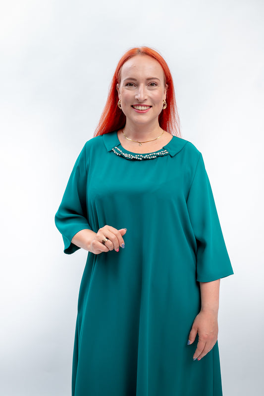 Klasiska zaļa kleita ar spīdumiem ap kaklu