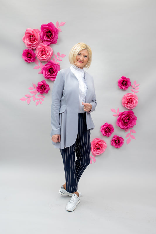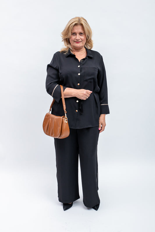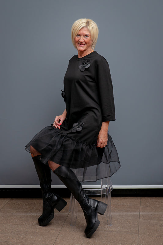Antracīta krāsas kleita ar ziedu uzšuvumu
