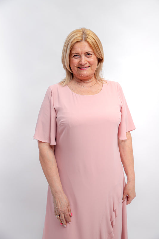 Pūderrozā kleita ar volānpiedurknēm un jostu