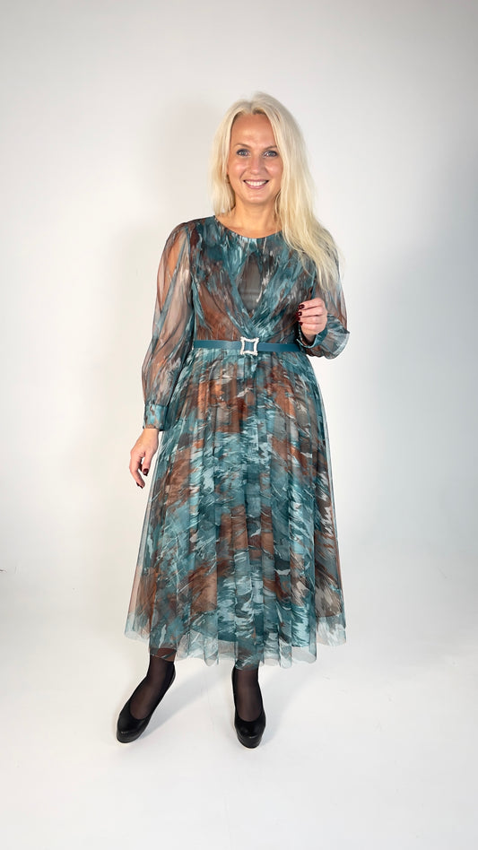 Šifona kleita ar maigu rakstu un jostu