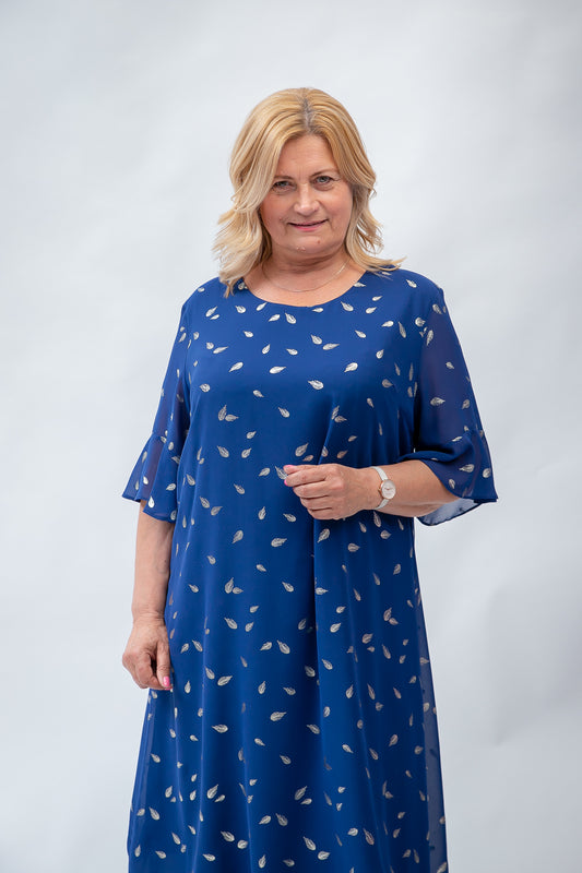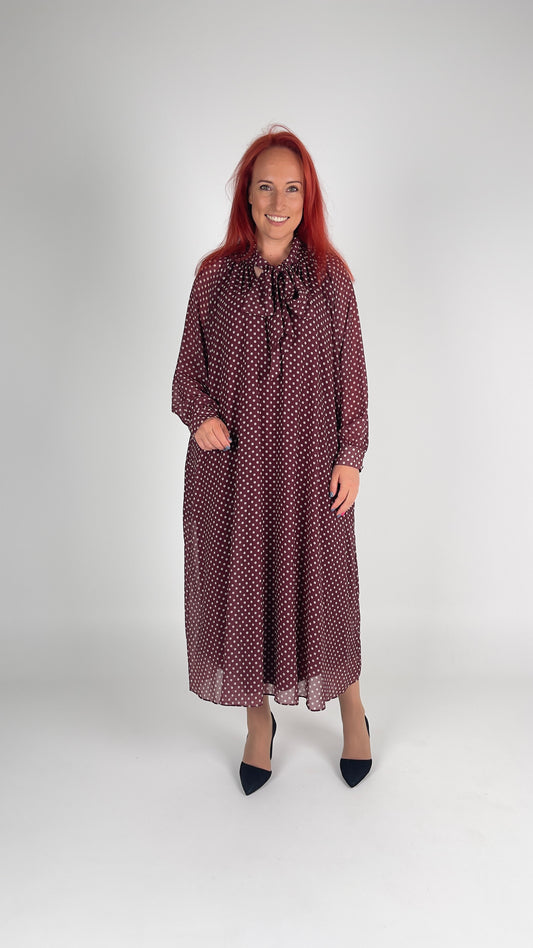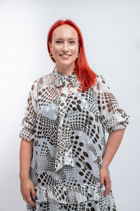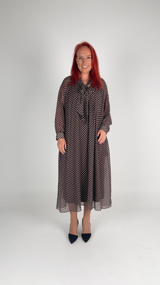 Šifona kleita ar smalku pumpiņu rakstu un jostu