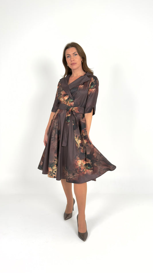 Šokolādes krāsas kleita ar ziedu uzšuvumu