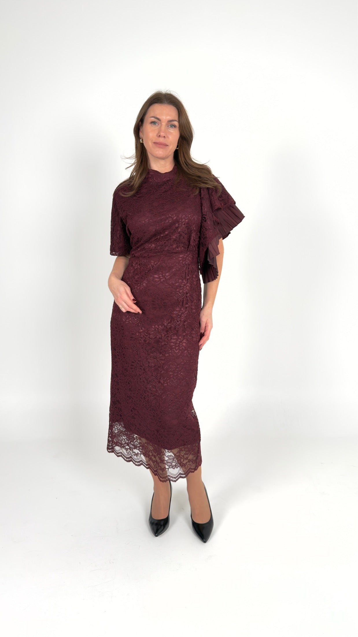 Bordo mežģīņu kleita ar asimetrisku volānu piedurkni
