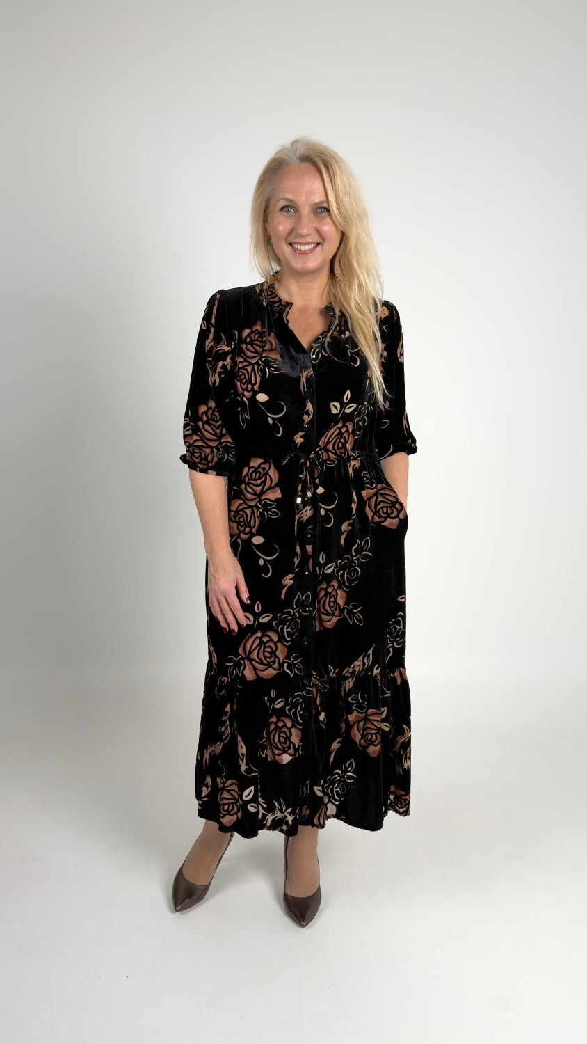 Samta kleita ar sasienamo jostu un ziedu rakstu