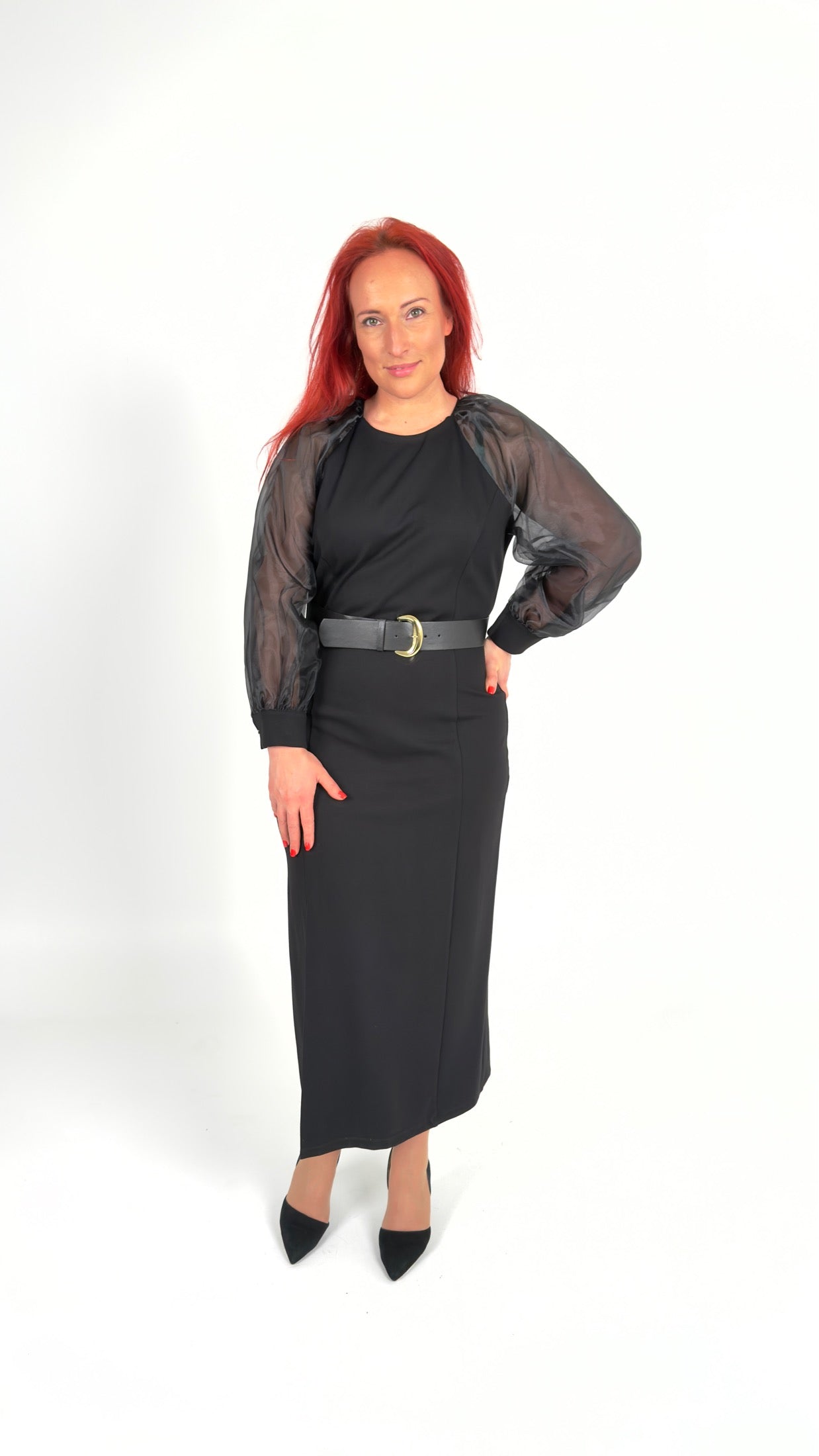 Sievišķīga gara melna kleita ar šifona piedurknēm un jostu