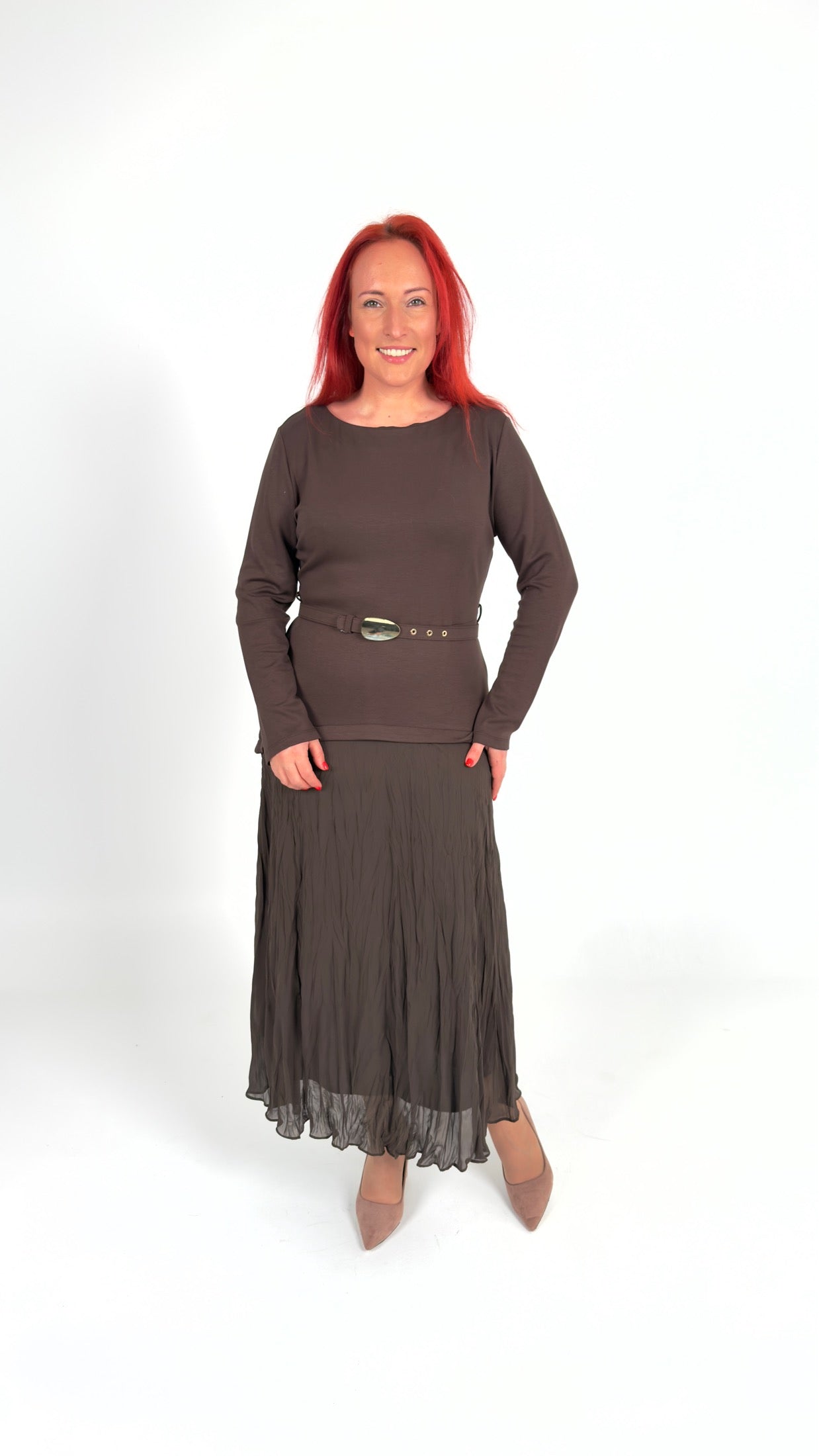 Šokolādes krāsas kleita ar plīsetiem svārkiem
