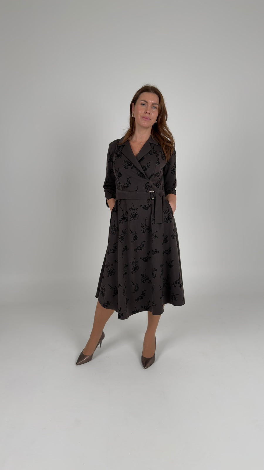 Šokolādes krāsas kleita ar ziedu uzšuvumu