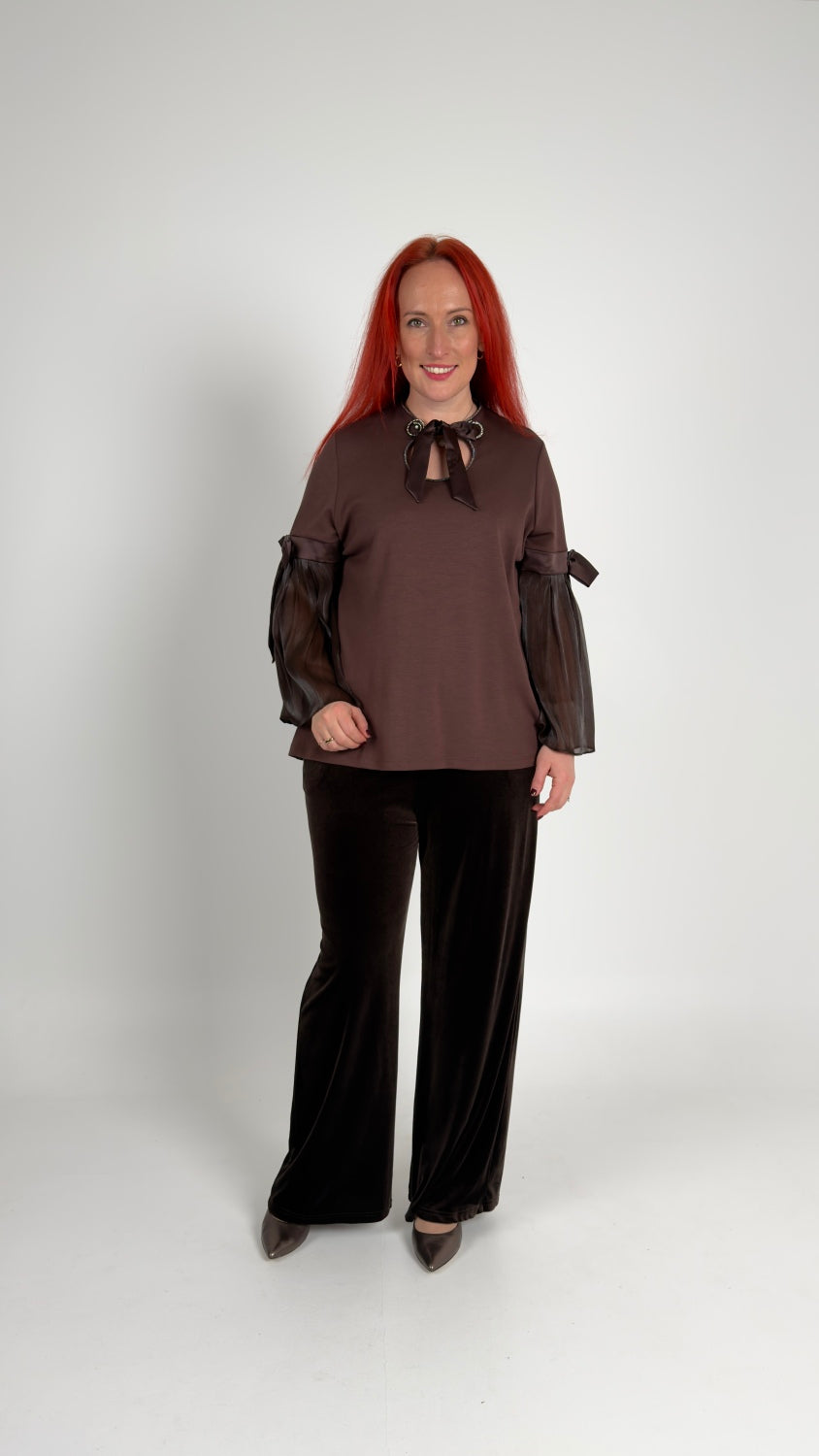 Trikotāžas augša ar tilla piedurknēm un dekoratīvām bantītēm